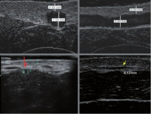 L’un des traitements les plus courants effectués dans les cliniques de phlébologie et de médecine esthétique est la fermeture de petits vaisseaux sanguins dans les membres inférieurs, appelés télangiectasies et vaisseaux réticulaires. Actuellement, il existe plusieurs méthodes qui permettent de fermer les vaisseaux dilatés et d’obtenir des effets souhaitables, tant thérapeutiques qu’esthétiques. Malheureusement, malgré l’application de diverses méthodes et instruments, les effets des traitements ne sont souvent pas satisfaisants. Le facteur qui contribue largement à la diminution de l’efficacité de ces procédures est l’anatomie compliquée du système veineux et l’absence de méthode pour spécifier avec précision le trajet du vaisseau, son diamètre, sa localisation dans la peau, etc. L’échographie à haute fréquence est une méthode permettant de déterminer avec précision le trajet des vaisseaux ainsi que de mesurer leurs paramètres de base, tels que le diamètre, la profondeur dans la peau et la présence ou l’absence de perfusion. Grâce à l’imagerie échographique utilisant des transducteurs à haute fréquence, une méthode de traitement et des paramètres de procédure adéquats peuvent être sélectionnés, ce qui implique d’améliorer l’efficacité de la procédure elle-même. L’échographie peut également être utilisée pour le suivi des procédures effectuées.