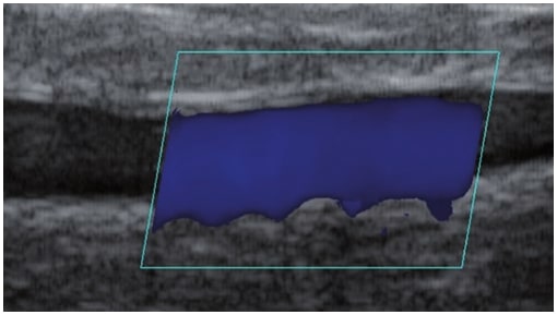 La sonographie Doppler permet l’imagerie des gros vaisseaux et des perforantes qui sont généralement situés dans les couches plus profondes du tissu sous-cutané (fig. 1). Malheureusement, la sonographie conventionnelle n’est pas capable d’imager les vaisseaux plus petits. Afin de visualiser les vaisseaux plus petits situés près de la surface de l’épiderme et dans la couche supérieure du tissu sous-cutané, l’EHF est utilisée (fig. 1). Grâce à l’utilisation de transducteurs dont les fréquences sont supérieures à 20 MHz, une image échographique à haute résolution est obtenue dans laquelle nous pouvons différencier des structures qui sont plus petites que 0,1 mm. Cependant, plus la résolution est élevée, moins la pénétration du faisceau ultrasonore dans les couches de la peau est profonde. Par conséquent, selon le transducteur et l’appareil, il est possible de pénétrer la peau jusqu’à une profondeur maximale de 20–30 mm. Une telle pénétration, associée à une haute résolution d’image, permet l’évaluation de vaisseaux sanguins même très petits (fig. 2). Pendant l’examen avec l’utilisation de transducteurs à haute fréquence, on peut évaluer avec précision le trajet et l’emplacement des petits vaisseaux dans la peau. Cela est particulièrement pertinent pour la sélection de la méthode de fermeture des vaisseaux et la planification de la procédure, car en pratique, la surface de la peau ne montre très souvent qu’un petit nombre de vaisseaux ou un léger fragment de vaisseau – ce n’est qu’après l’examen US que nous pouvons déterminer leur nombre réel et leur trajet. Pour une fermeture efficace du vaisseau, il est nécessaire de le faire sur toute sa longueur. Elle ne doit pas se limiter au fragment vu « à l’œil nu » à la surface de la peau, car la fermeture du fragment entraînera sa recanalisation rapide(7). Fréquemment, le vaisseau visible à la surface de la peau change de trajet, devient plus tortueux et se déplace vers les couches plus profondes de la peau(8). Par conséquent, le trajet de la veine et des perforantes doit être bien connu et déterminé avant la procédure. L’EHF permet également l’imagerie des perforantes entre les petits vaisseaux. De plus, outre l’évaluation du trajet et de l’anatomie, l’image échographique, grâce au logiciel d’échographie, permet également de déterminer les paramètres de base tels que le diamètre du vaisseau, l’épaisseur de sa paroi, la profondeur dans la peau ainsi que la présence ou l’absence de perfusion à l’intérieur du vaisseau(6) (fig. 3). Grâce au transducteur électronique multi-éléments d’une fréquence de 40 MHz introduit sur le marché par Ultrasonix, il est également possible de visualiser la perfusion des vaisseaux en mode Doppler couleur (fig. 4).