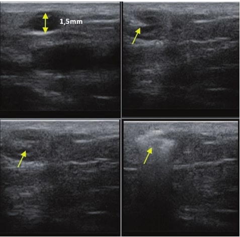 Cet article a présenté le sujet lié à l’application de l’EHF dans l’imagerie et la fermeture des petits vaisseaux veineux, c’est-à-dire les télangiectasies et les veines réticulaires. L’introduction de transducteurs à haute fréquence supérieure à 20 MHz a permis de visualiser les vaisseaux situés dans le derme et le tissu sous-cutané, ce qui n’est pas possible avec l’utilisation de sondes conventionnelles ou d’autres méthodes. La sonographie comme méthode d’imagerie des petits vaisseaux répond aux attentes des chirurgiens et des phlébologues qui, jusqu’à présent, ont été privés de la possibilité d’évaluer les petits vaisseaux sanguins. Les diaphanoscopes (transilluminateurs) avaient des limites car ils ne permettaient que d’évaluer le trajet des vaisseaux peu profonds(12) sans la possibilité de spécifier leur emplacement exact ou leur diamètre. Cependant, la possibilité d’évaluer le trajet des vaisseaux, de mesurer leurs diamètres et de spécifier leur emplacement dans la peau contribue à la sélection d’une méthode thérapeutique. Ainsi, ces facteurs améliorent l’efficacité de la procédure sélectionnée et réduisent le risque de complications. Dans le cas des traitements au laser, les images échographiques facilitent la sélection du laser pour une procédure et permettent de déterminer les paramètres de traitement(7). La sonographie est également utile comme méthode de surveillance des procédures visant à l’élimination des vaisseaux. Sans imagerie échographique, l’exécution de certaines procédures ne serait pas faisable, par exemple, les procédures micro-endovasculaires sans guidage échographique ou la microsclérose sans imagerie échographique des petits vaisseaux. Cette dernière procédure réalisée sans guidage échographique est grevée d’un grand risque de complications sous forme de nécrose causée par l’administration du sclérosant au-delà de la lumière du vaisseau.