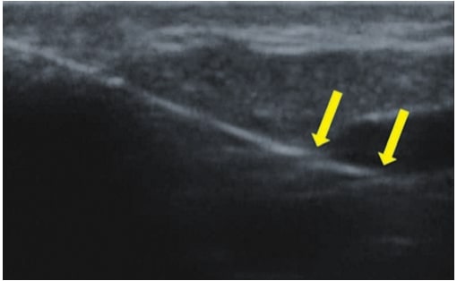 La sclérothérapie est une technique de fermeture des vaisseaux résultant de leur injection avec un sclérosant chimique. À l’heure actuelle, elle est couramment appliquée et se caractérise par, avant tout, de faibles coûts et le fait qu’elle est relativement facile à réaliser. La sclérothérapie est principalement indiquée pour la fermeture des veines réticulaires de plus de 3 mm, mais peut également être appliquée si les vaisseaux sont plus petits(10). Dans le cas de vaisseaux plus petits que 3 mm, il est plus difficile d’insérer une aiguille dans leur lumière, ce qui augmente le risque de complications(7). Dans une telle situation, l’EHF s’avère utile. Elle permet une visualisation précise du trajet du vaisseau et, par la suite, facilite l’exécution de la procédure sous guidage échographique (fig. 6). Ainsi, grâce à l’échographie, le risque d’administrer le sclérosant au-delà de la lumière du vaisseau, ce qui entraîne une nécrose, a été éliminé. L’imagerie par échographie à haute fréquence peut également être utilisée pour surveiller l’efficacité de la procédure.